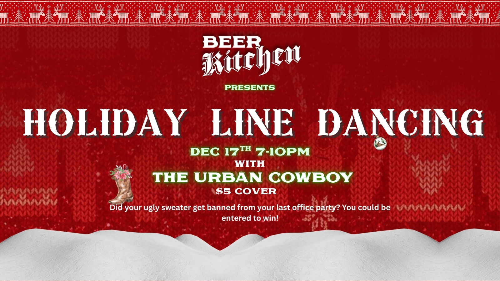 Join us at the Beer Kitchen December 17th at 7PM for Holiday Line Dancing with the Urban Cowboy. Holiday themed attire is encouraged; the dancer with the kitschiest outfit wins a prize!